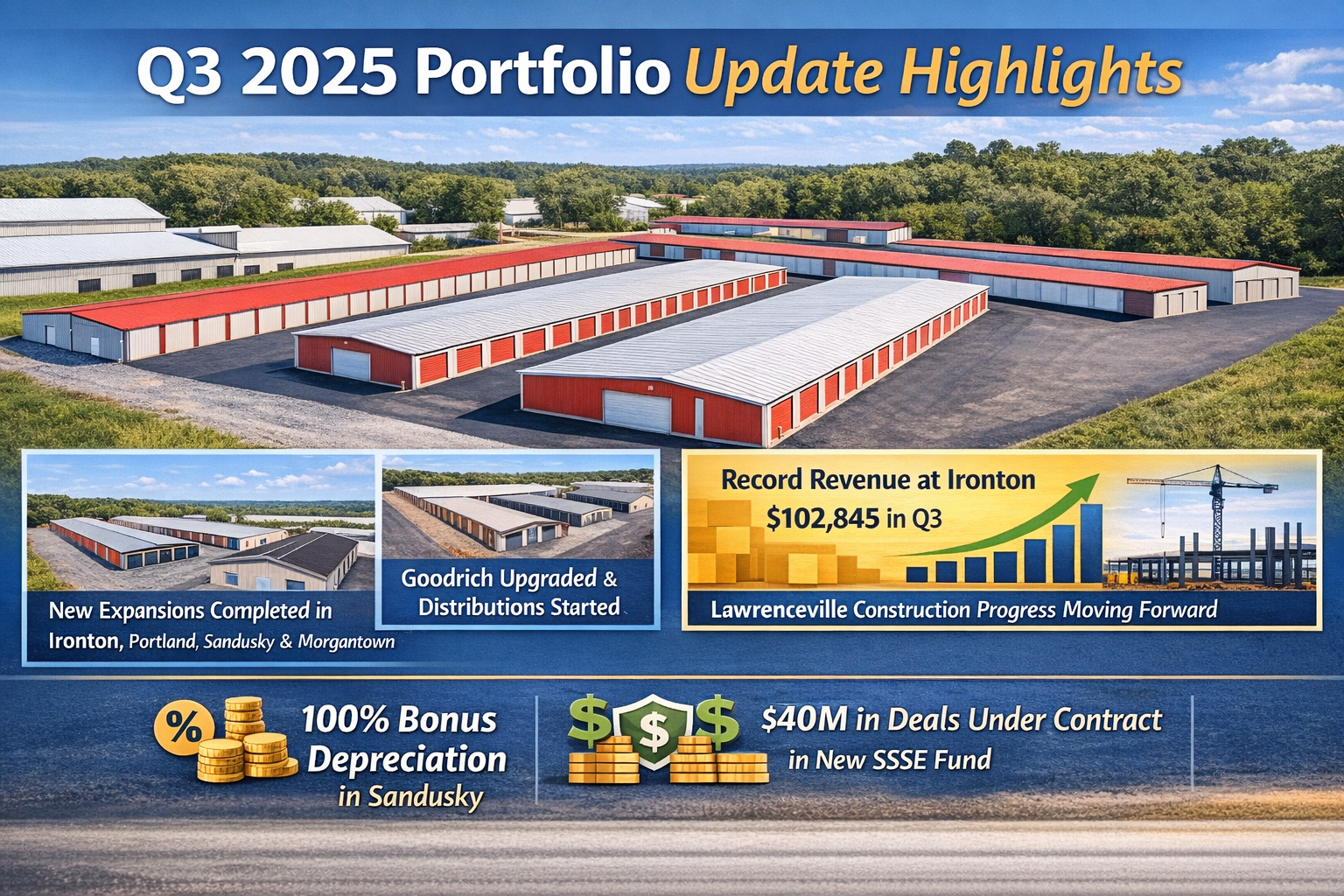 Several expansion and value-add projects are now fully constructed, including Ironton, Portland, Sandusky, and Morgantown, positioning these assets for the next phase of lease-up, stabilization, and long-term value growth. In Morgantown, we are actively underwriting equipment financing for the portable unit expansion, a move expected to improve margins, reduce payroll and insurance costs, smooth seasonal cash flow, and elevate the facility to an institutional-quality asset. This expansion also unlocks meaningful tax benefits through Section 179 depreciation.